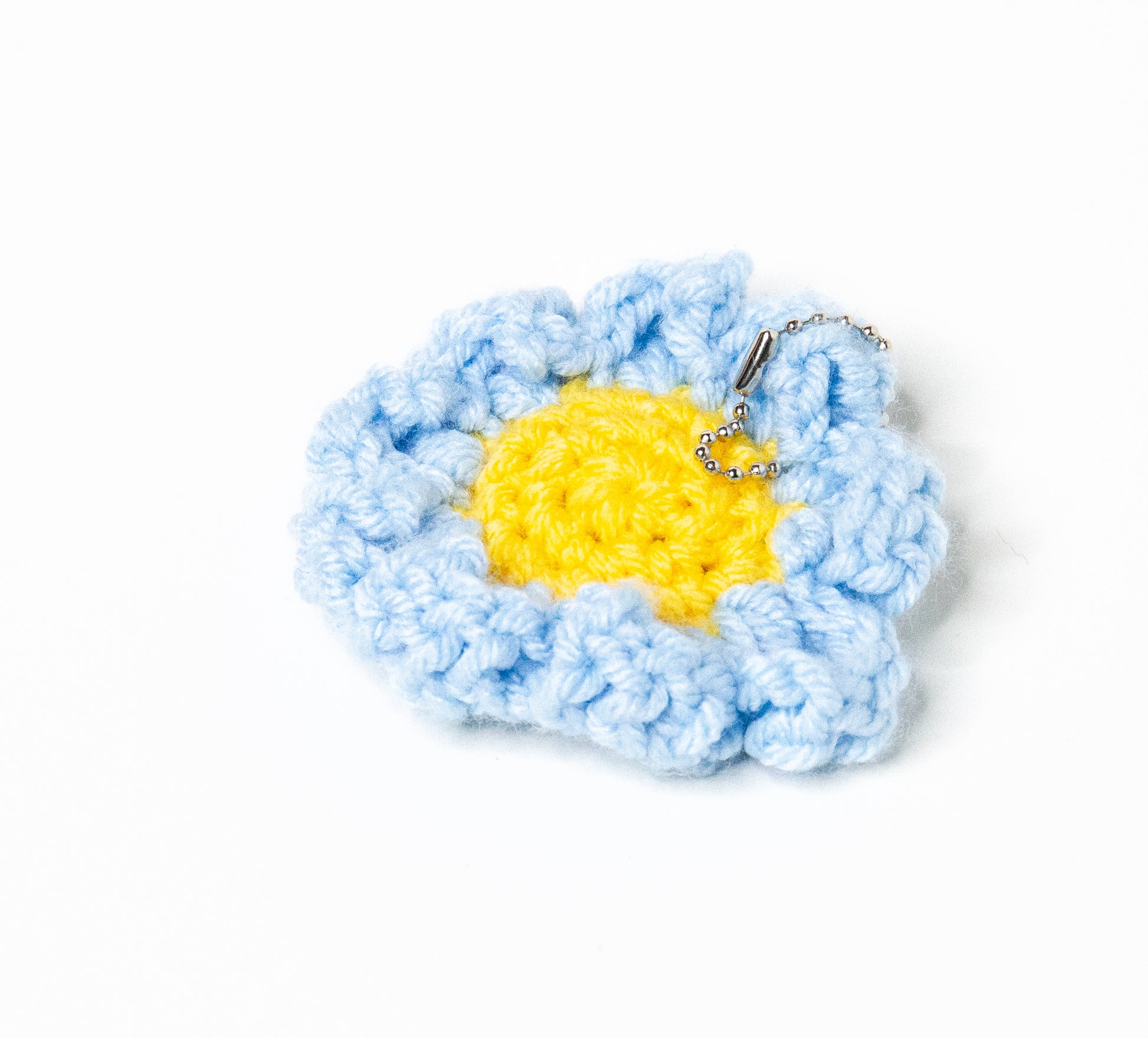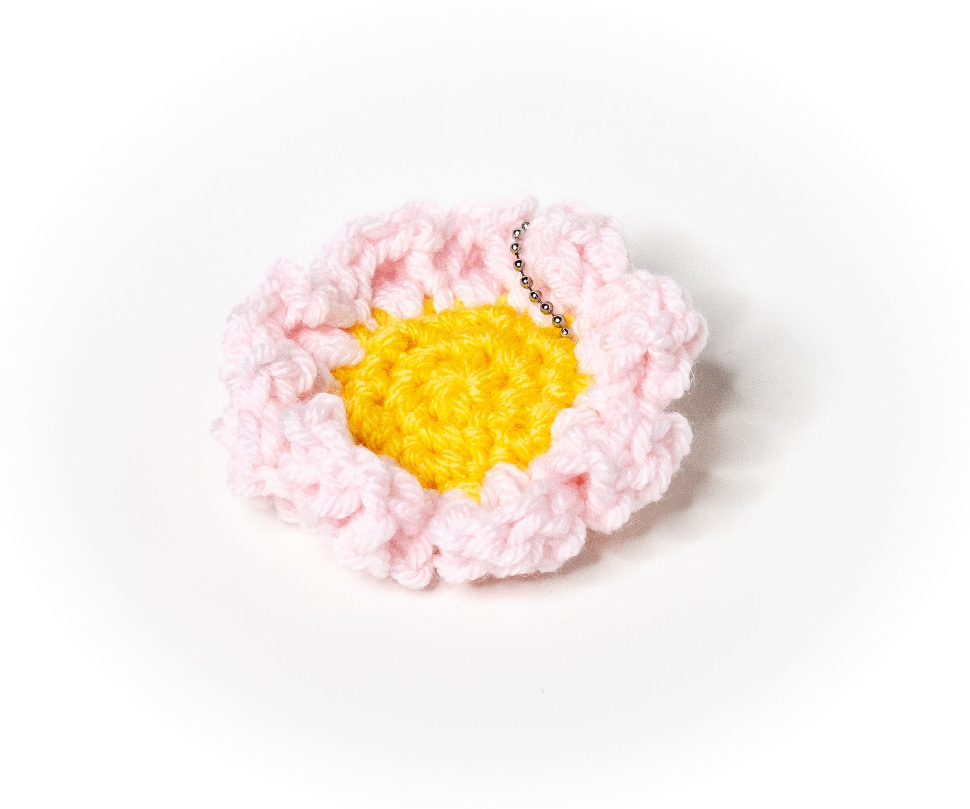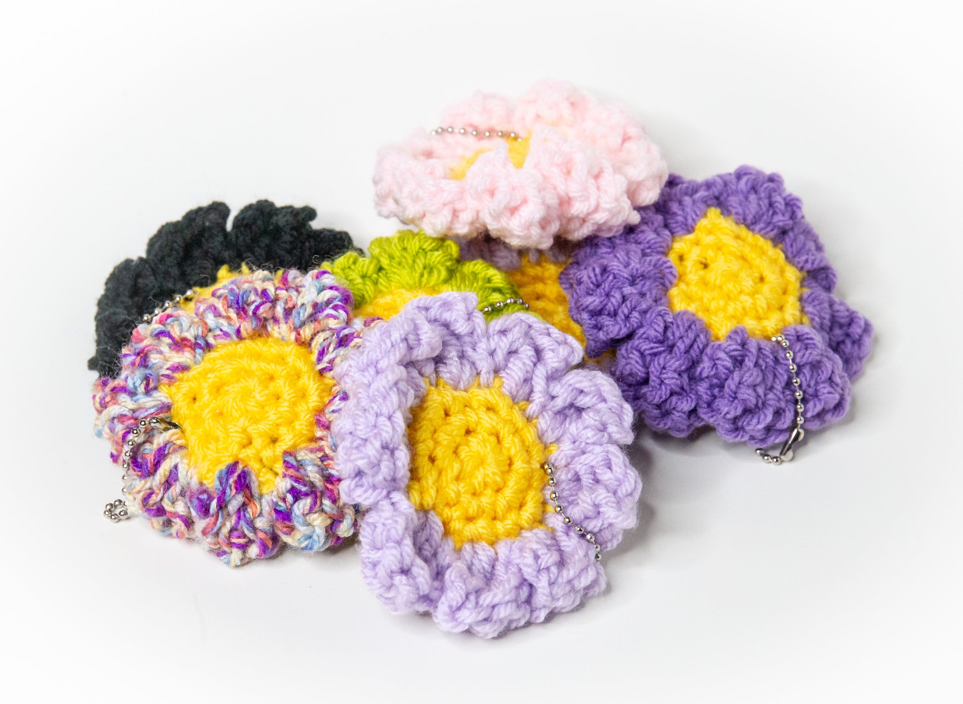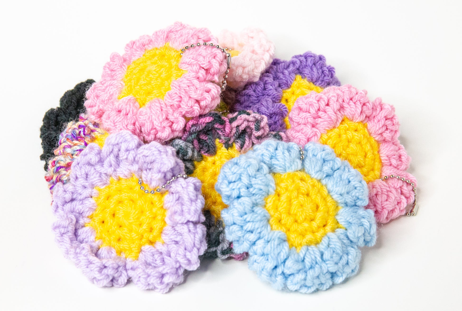 Daisy keychains that come in many colors. Crocheted and created by me.